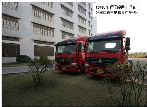 TOPSUN依靠保税区仓储、物流园区仓储、代理进出口报关报检等主营业务提供珠三角拖车运输配套服务,包括清关的码头提重柜还吉柜、出仓运输配送等,凭借公司严格的管理制度和先进的高度平台,协同作业高效快捷,对司机及押运人员有着严格管理规定保证运输货物安全。